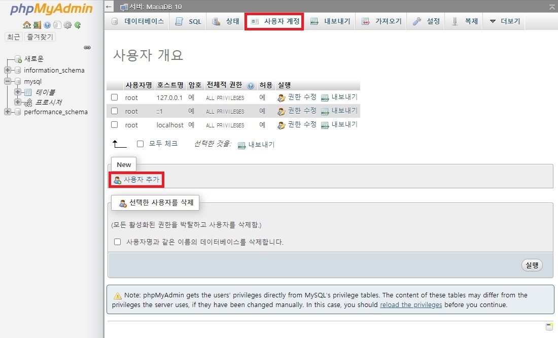이후 DB생성이나 사용자 생성 테이블 등등은 phpMyAdmin 을 쓰거나 다른 DB 접속 클라이언트로