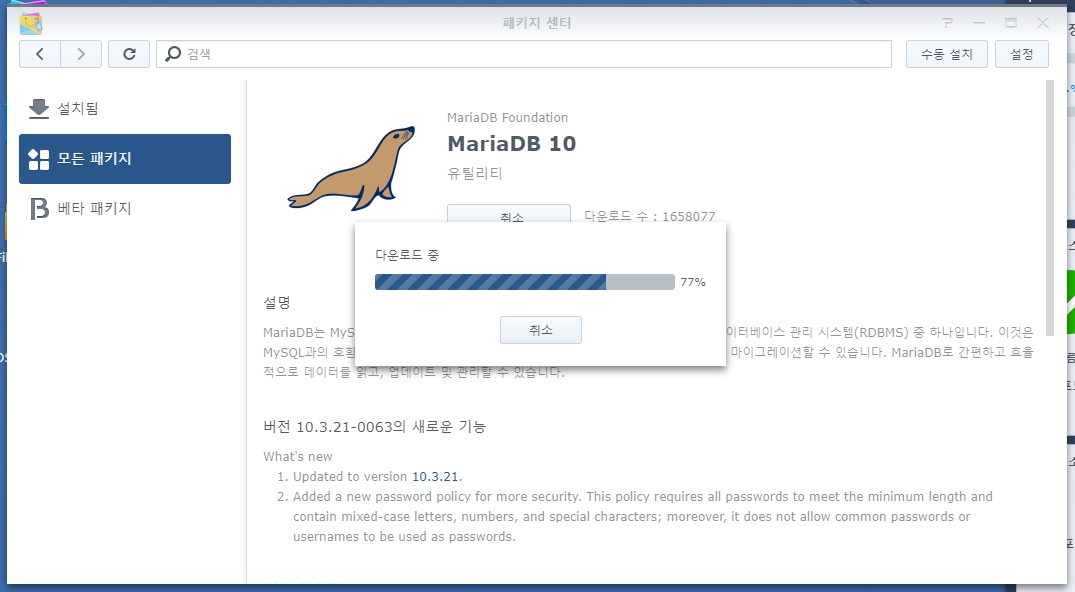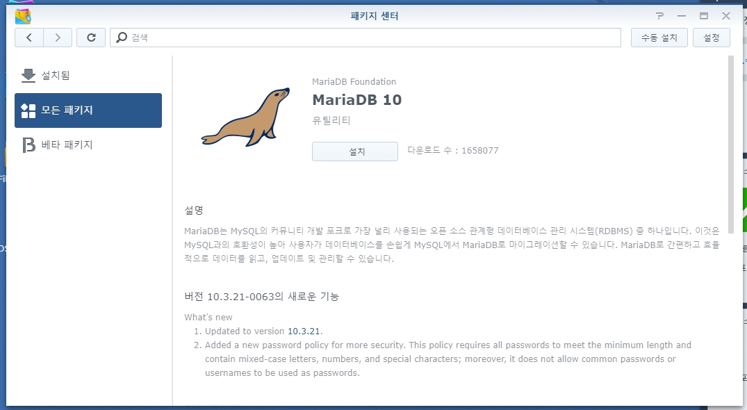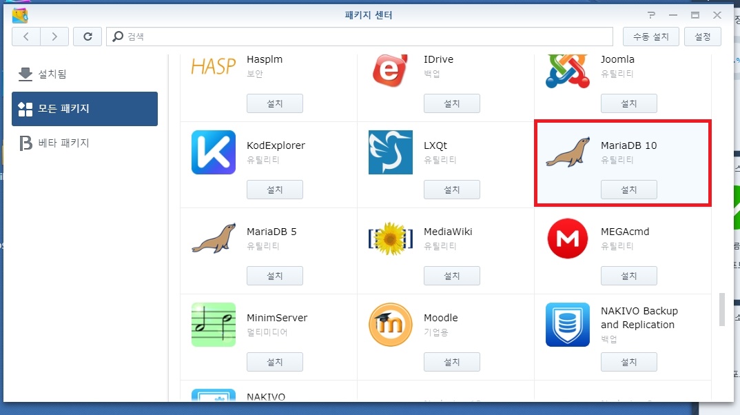 우선 피키지센터 에서 모든패키지 를 클릭하고 스크롤을 내리다 보면 아래 이미지 처럼 MariaDB 10 패키지가 나온다.