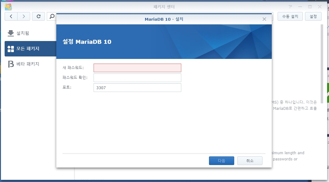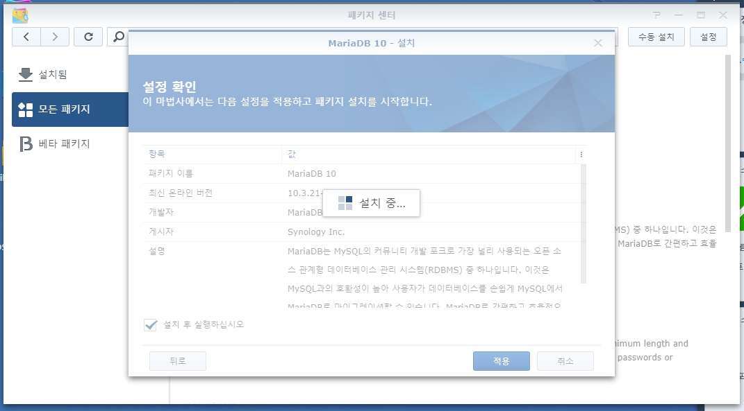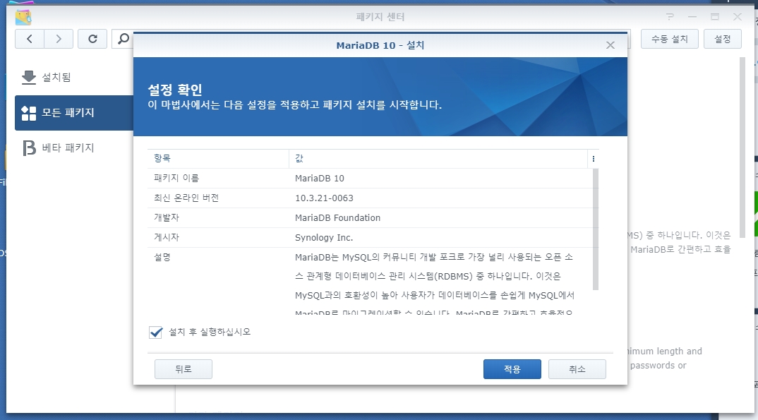 시놀로지에서 MariaDB를 써야하는 패키지는 설치하는 과정에서 정보만 입력해주면 되지 별도로 위와 같은 수동 처리를 할 필요는 없다.