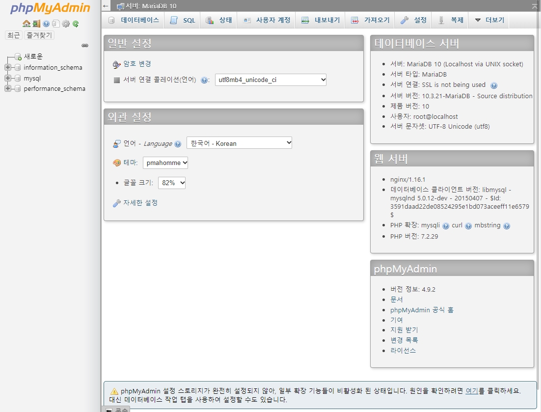 http://nas.abc.com:9080/phpMyAdmin/ 으로 접속하면 아래 화면이 나온다.