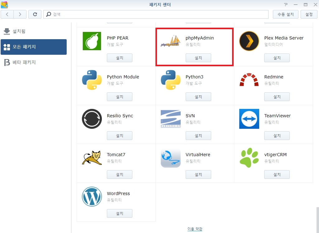 시놀로지 패키지 설치에만 쓴다면 아래 같은 phpMyAdmin 도 설치할 필요는 없을것 같다. 아마도...?^^;;