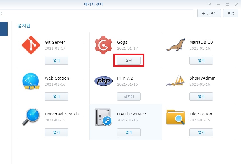 헤놀로지를 재부팅하면 Gogs 패키지는 자동실행되지 않는다. 매번 부팅시마다 "실행"버튼을 클릭해줘야 한다.