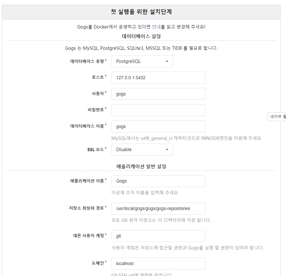 다음은 저 URL 정보로 접속해서 gogs 설정을 해주면 된다.