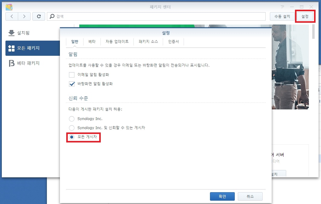 "설정" 을 클릭하고 "모든 게시자" 를 선택한다.