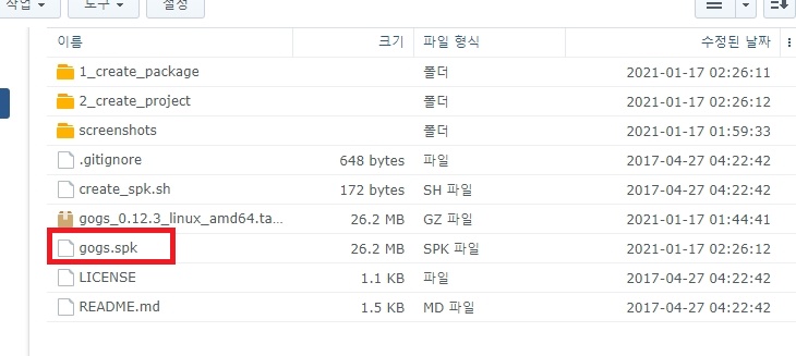 H. 위의 명령을 실행하면 아래와 같이 gogs.spk 라는 패키지 파일이 생긴다.