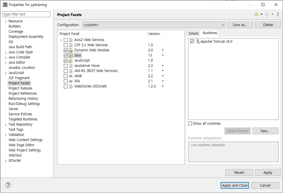 프로젝트 우클릭 하고 Properties -> project Facets -> Java 화면 우측에 runtimes 탭에서 맞는 Tomcat 버전을 체크 해주면 된다.