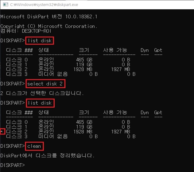clean 명령을 수행한다. 자신의 다른 디스크를 날리지 않도록 주의 해서 실행할 것 (하드디스크 초기화도