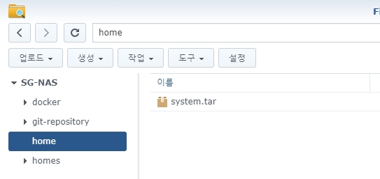 이 system 디렉토리를 tar 로 묶어서 DSM 에서도 보여기제 계정/home 경로에 옮겨놓는다.