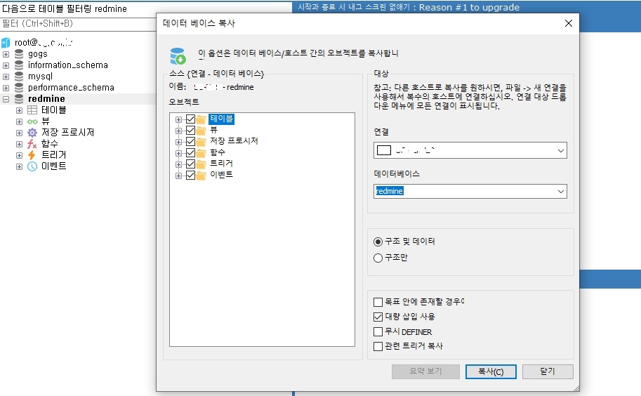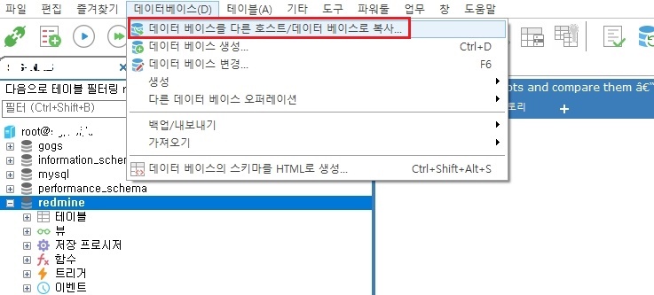그러면 아래 이미지 처럼 "데이터베이스" 메뉴를 통해 몇번의 클릭으로 Redmine DB를 복사할수 있습니다.