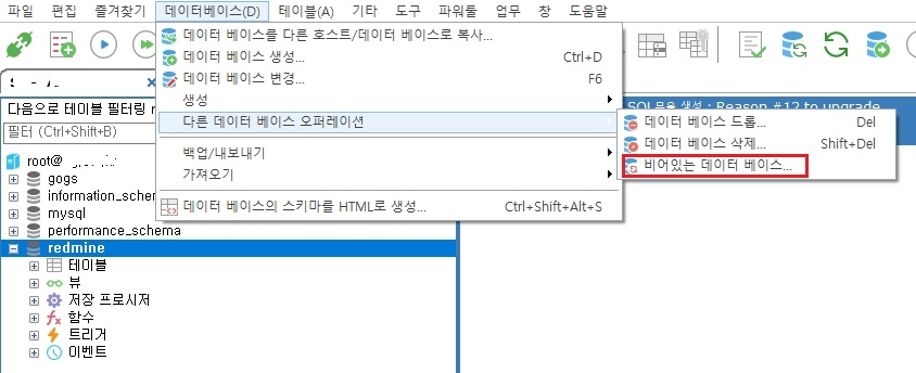 "비어있는 데이터 베이스" 로 만들어 버렸다. 그럼 그 하위에 테이블부터 뷰, 함수 등등 몽땅 삭제되고 DB 이름만 남는다.