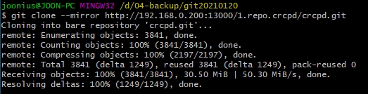 1시간 간격으로 미러링 하고 또 주기적으로 위의 방식을 이용 로컬 PC에 Git을 받아놓는다.
