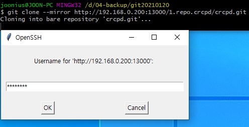 그러면 환경에 따라 조금 다를수는 있지만 Git 저장소의 Username 과 Password를 입력하면