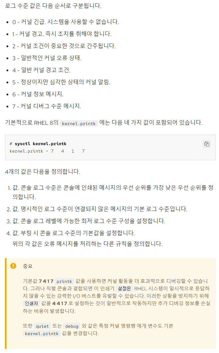 이 내용으로 보면 RHEL 8 에서도 기본 값이 "7 4 1 7" 인가 보다.